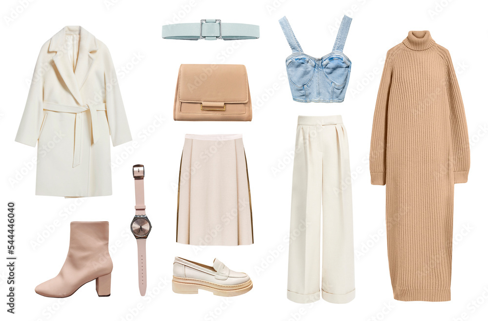 Casual women's clothes.Knitted clothing, fashion apparel.Girl's wear collection isolated set.