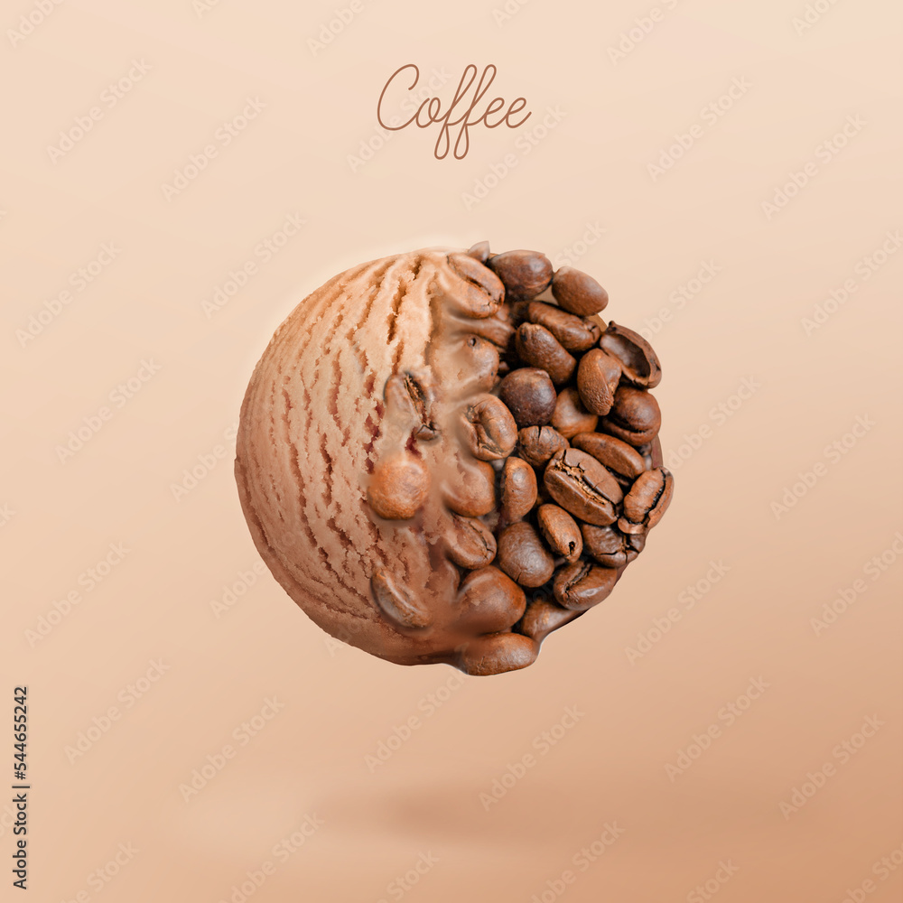 Coffee ice cream. Chocolate ice cream ball with chocolate chip explosion on gradient background. Delicious chocolate. 3d illustration.