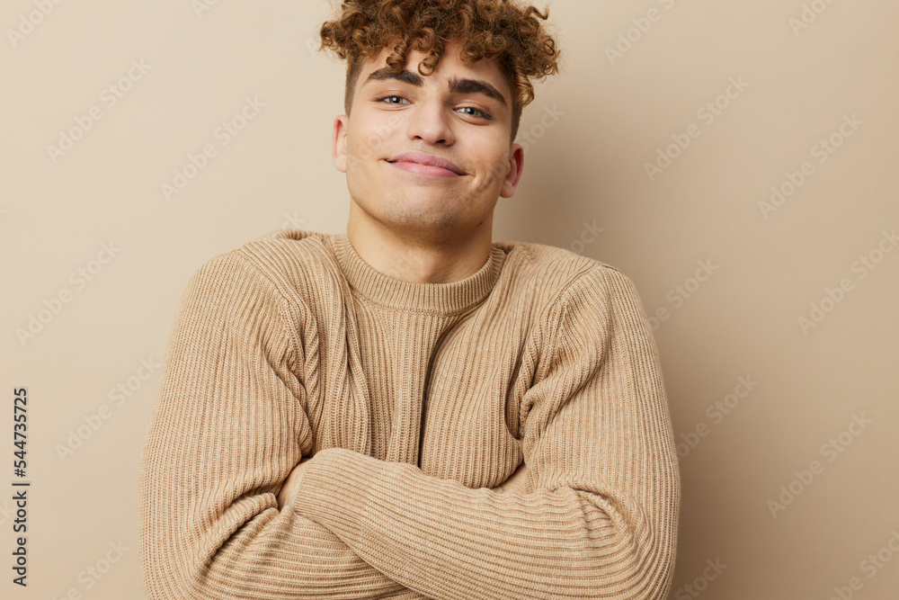 a close horizontal portrait of a handsome, charming man with curly hair standing in a beige sweater on a beige background, hugging himself with his arms
