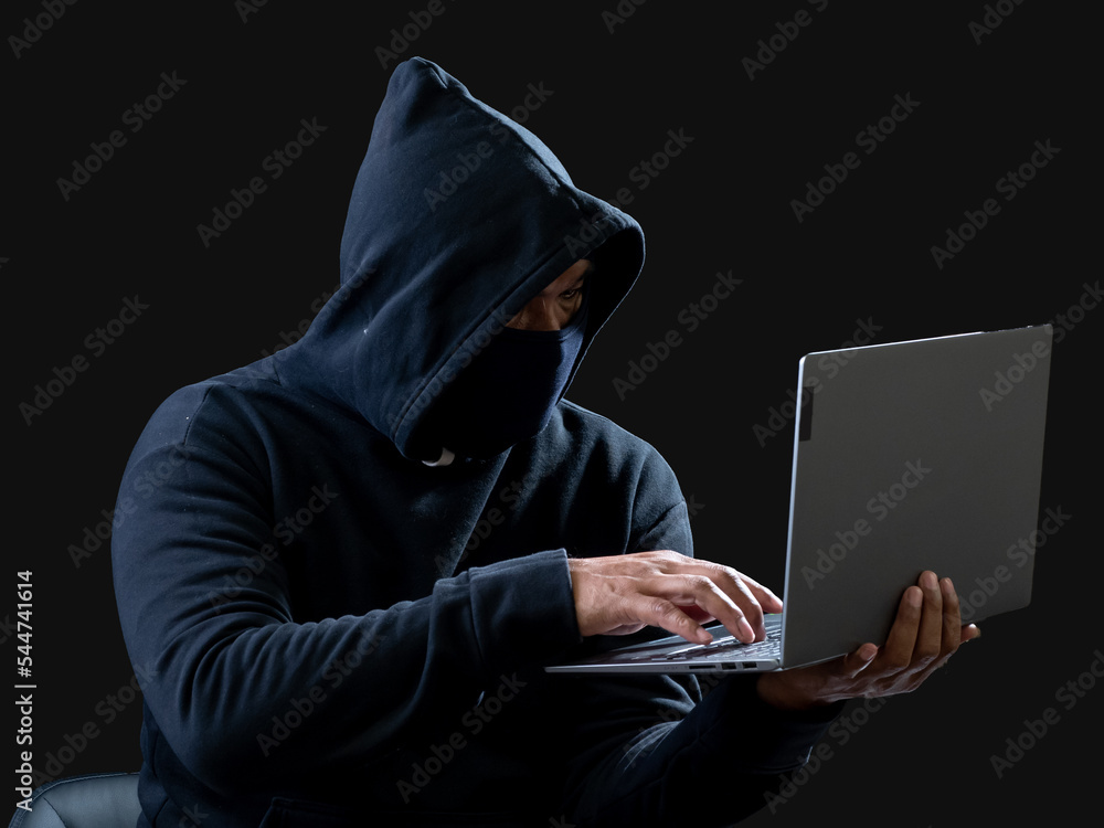 Hacker spy man one person in black hoodie sitting on a table looking computer laptop used login password attack security to circulate data digital in internet network system, night dark background.