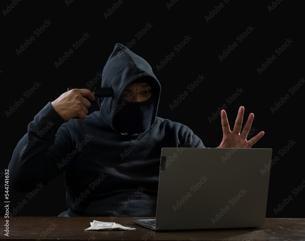 Hacker spy man one person in black hoodie sitting on a table looking computer laptop used login password attack security to circulate data digital in internet network system, night dark background.