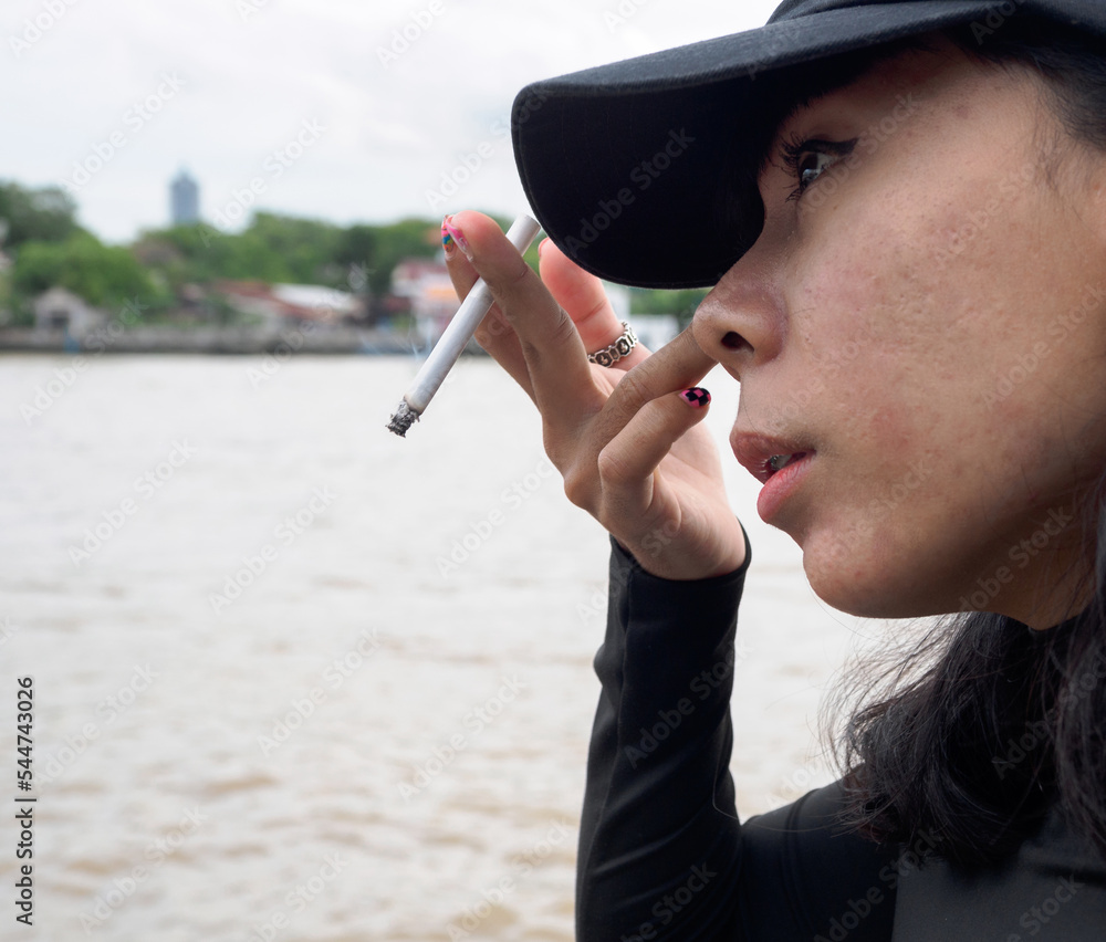 Portrait woman teen young asia one person wearing a hat and long black hair wearing a black shirt hand hold smoking cigarette white color standing outdoor by the wall