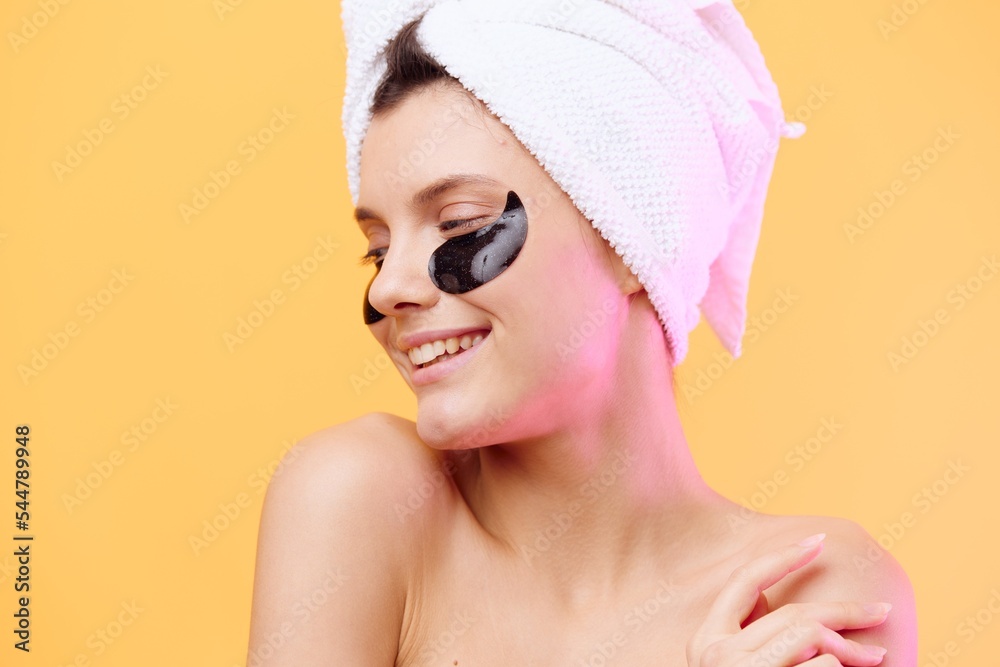 Horizontal photo, a woman with perfect skin on an orange background in a towel on her head and body with black patches on her face smiles brightly and looks away
