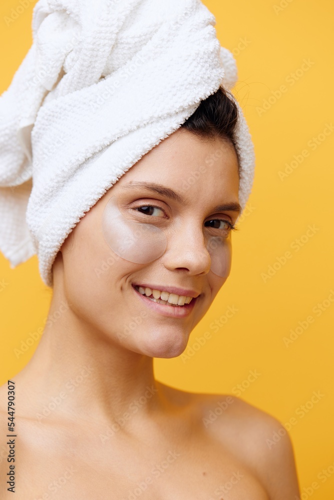 Vertical photo, a woman with perfect skin on an orange background after a shower in a towel on her head and you with patches on her face smiles beamingly