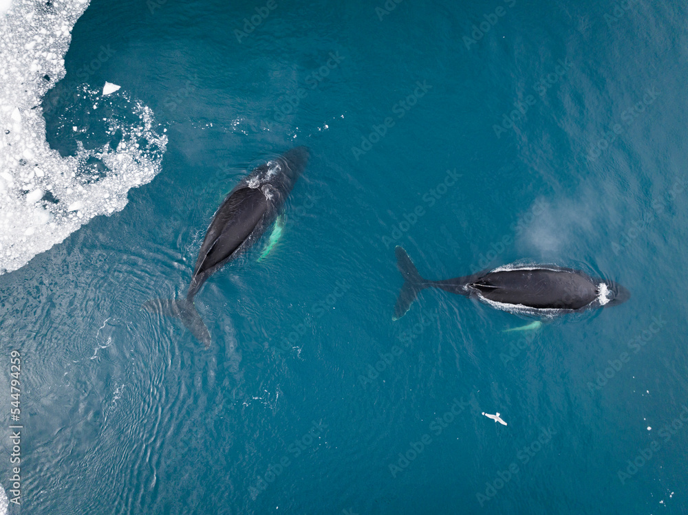 Ballenas yubartas descansando entre los icebergs a vista de drone.