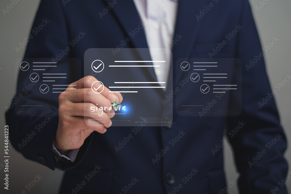 Electronic signature business concept. Manager is electronic sign an agreement on tablet, business approved, executing plan, project approved. digital signature. electronic document, digital business