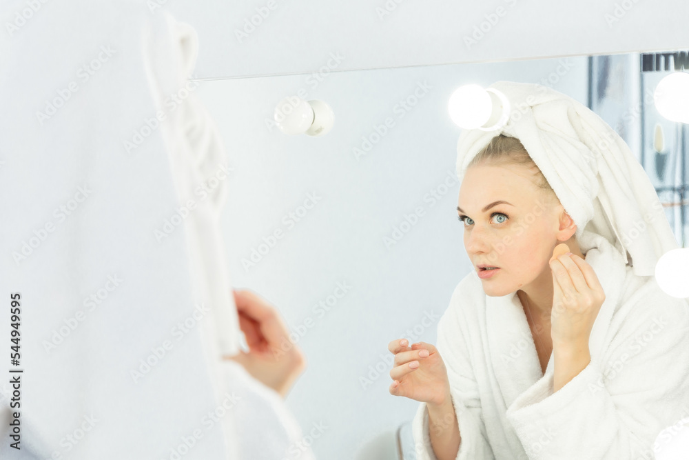 a girl takes care of her skin and looks carefully in the mirror, a young woman examines herself in the reflection of the mirror by applying cream on her face