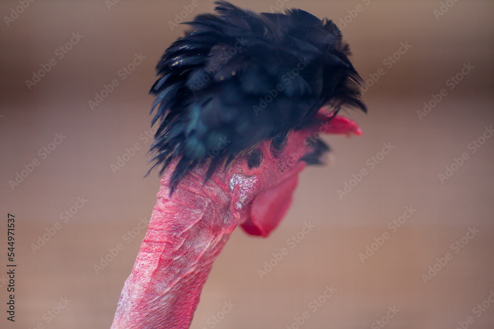 large bird head in a cage red skin on the neck, part of the bird neck with orange wrinkled hanging skin