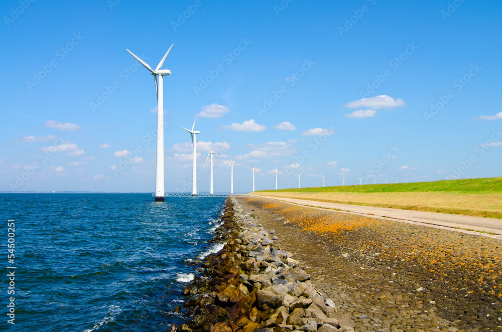 Wind energy windmills near highway and sea shore