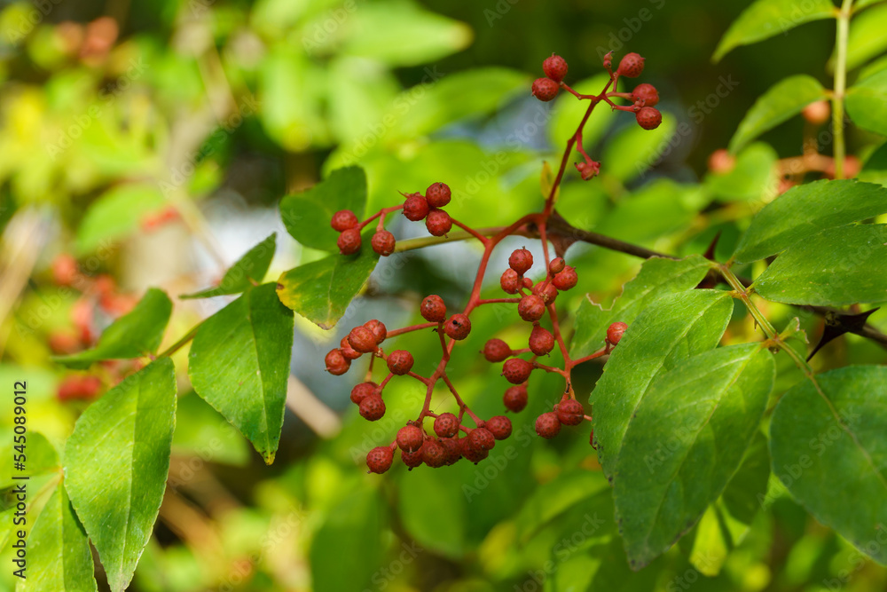 Red fruit of Zanthoxylum americanum, prickly ash, toothache tree, yellow wood, suterberry or Sichuan pepper in autumn garden on blurred green. Background for fresh wallpaper, nature background concept
