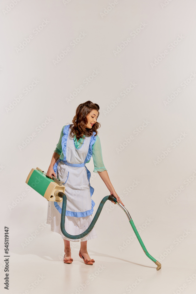 Portrait of young beautiful woman cleaning house with vacuum cleaner isolated over grey background