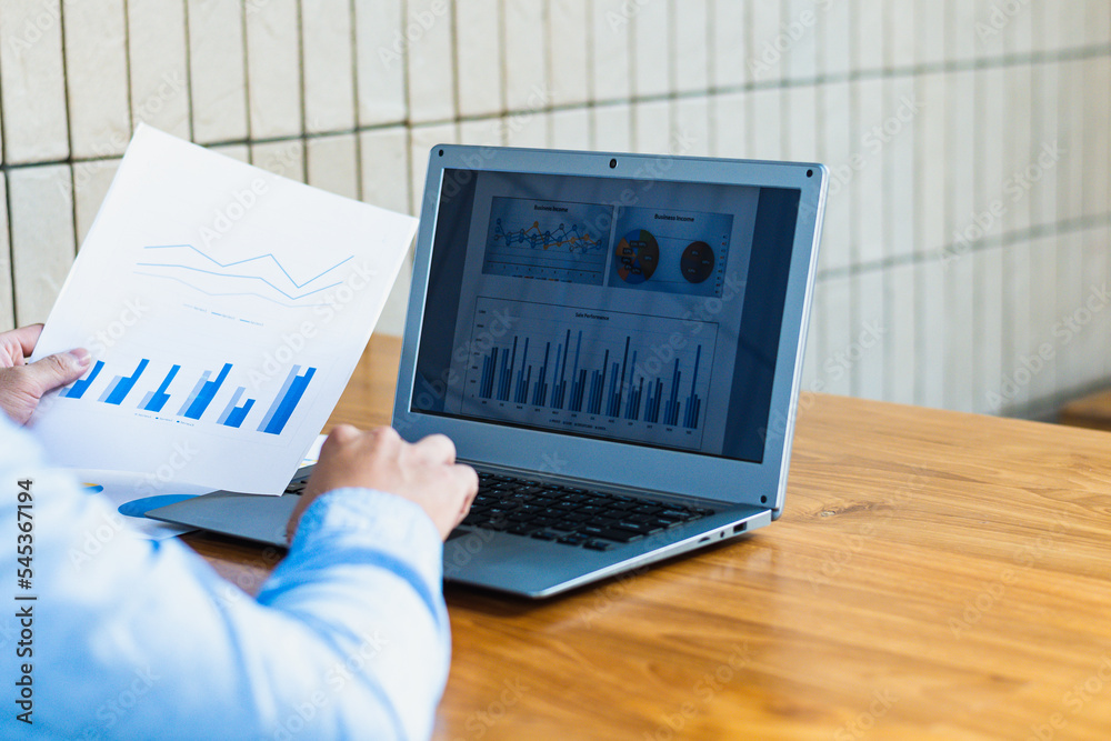 Executive holding business plan paper typing on laptop