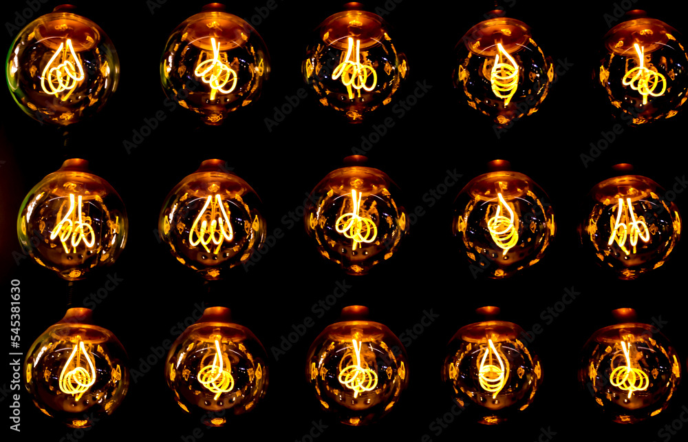 Isolated group of 15 yellow gold luminous retro classical spherical light bulbs in 3 rows with glowing filaments and black background