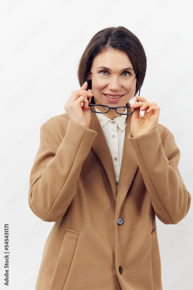 beautiful, attractive woman in a fashionable stylish coat puts on her glasses for vision while standing on a light background