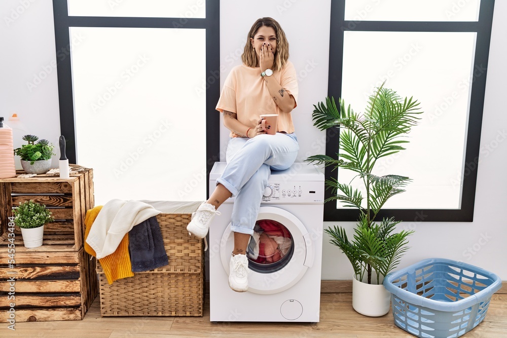 Young hispanic woman drinking coffee waiting for washing machine at laundry room laughing and embarrassed giggle covering mouth with hands, gossip and scandal concept
