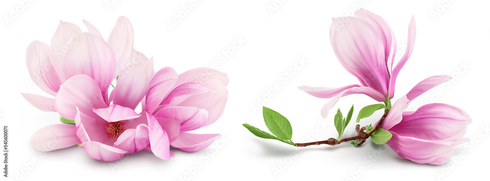 Pink magnolia flower isolated on white background with full depth of field