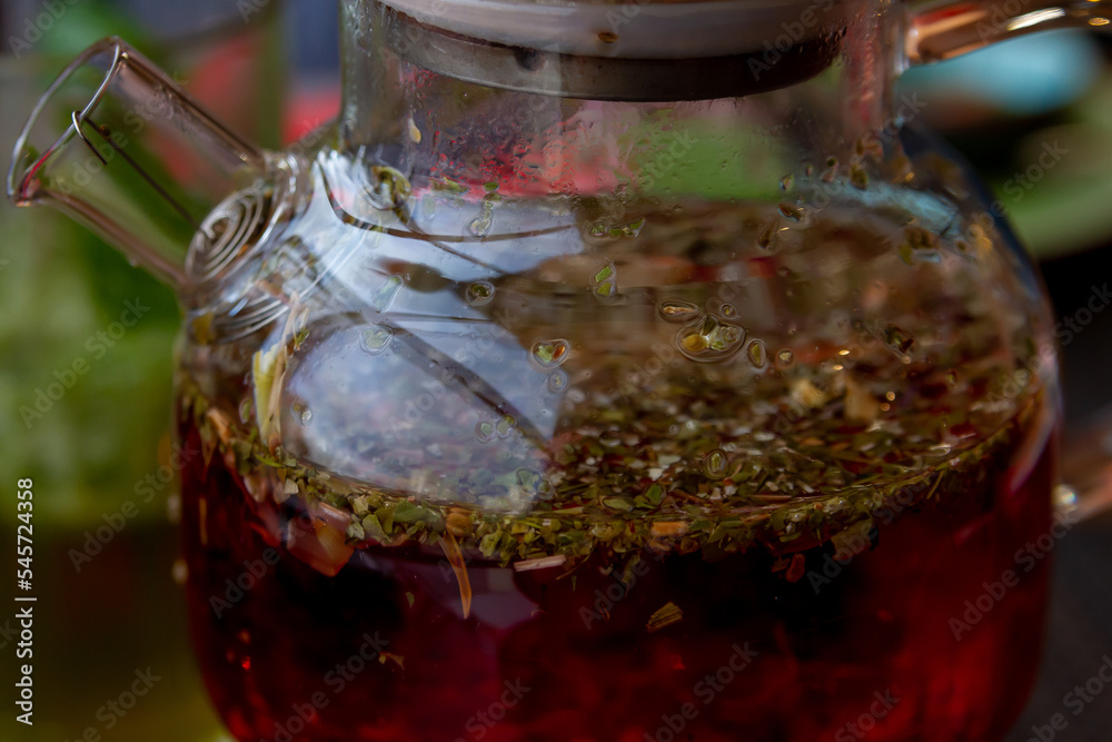 brewed tea is visible through the transparent glass wall of the teapot in the cafe, the dark theme of floating tea leaves