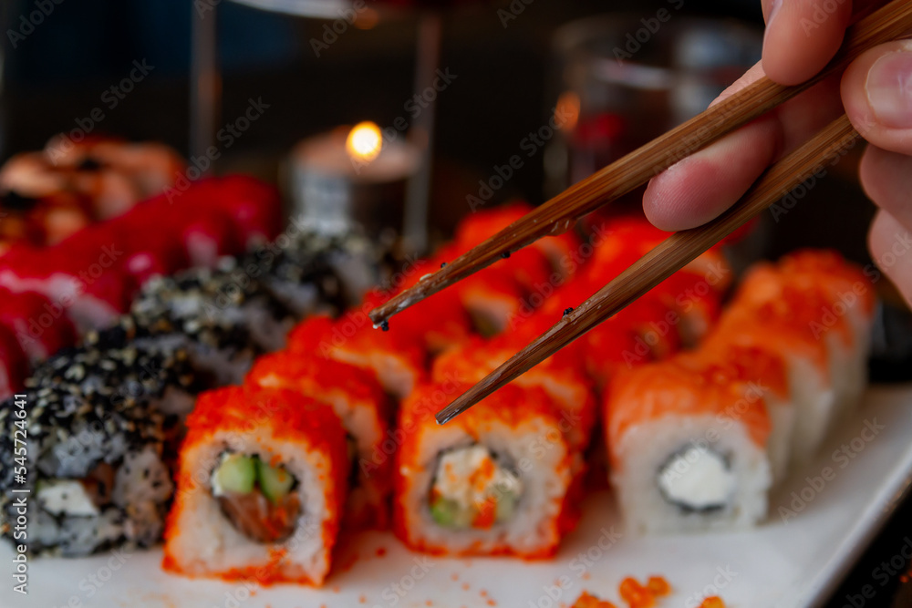 a large set of sushi with rice, Asian cuisine, various sushi rolls served on a white square ceramic plate, wooden chopsticks