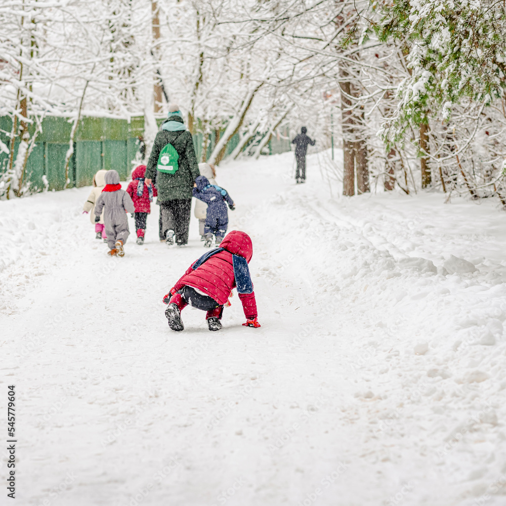 Winter, group of young children going for walk in fresh air, one child fell on in snow