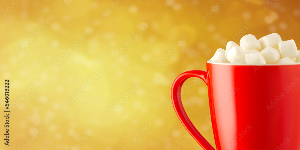Red cup of cocoa with marshmallow, on Christmas background. Banner for Xmas, traditional christmas and new year concept. copy space for text