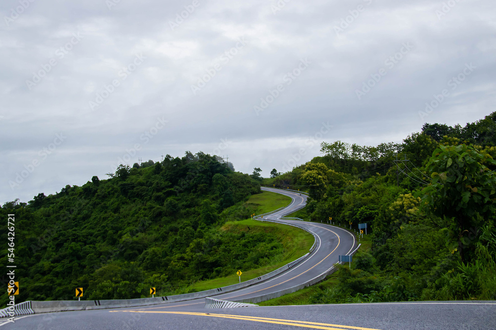 Beautiful Road No.3 or sky road over top of mountains with green jungle in Nan province, Thailand.