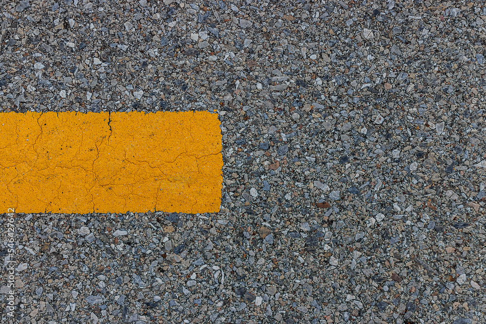 Background and texture of the road surface is small stones and yellow lines on asphalt.