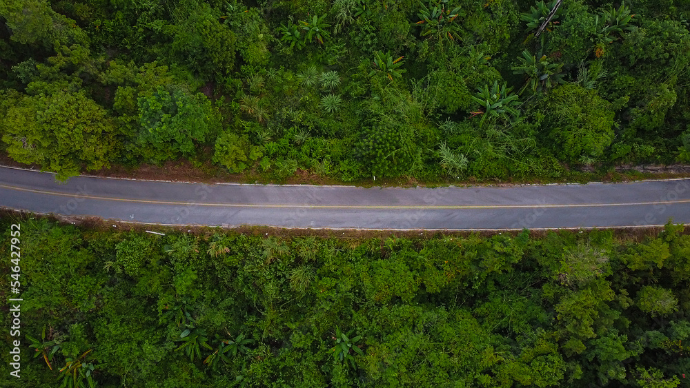 Aerial view forests ecosystems and healthy environmental and roads through lush forest.