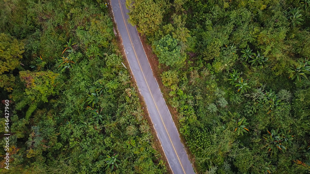 Aerial view forests ecosystems and healthy environmental and roads through lush forest.