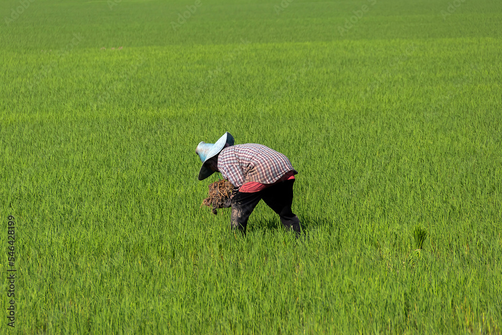 Farmers grow organic rice in the fields and used manual weeding in organic rice fields.
