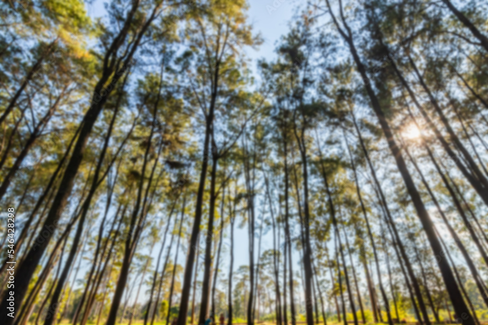 Pine forest nature and sunlight in mountain hill, blue sky background.