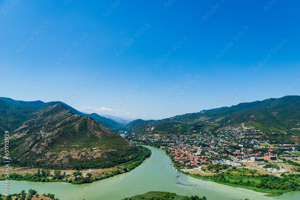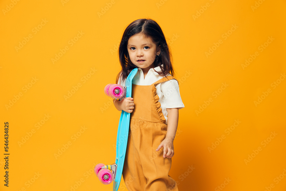 a cute, adorable little preschool girl stands with a blue skateboard in her hand, smiling adorably at the camera. Horizontal photo with empty space to insert an advertising layout