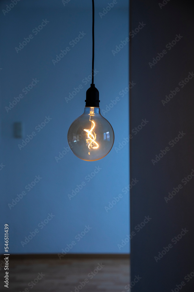Eingeschaltete Glühbirne hängt in einem dunklen Raum.