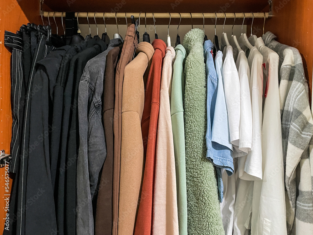 Variety of casual teenage girl clothes of different colors on hangers in wooden wardrobe