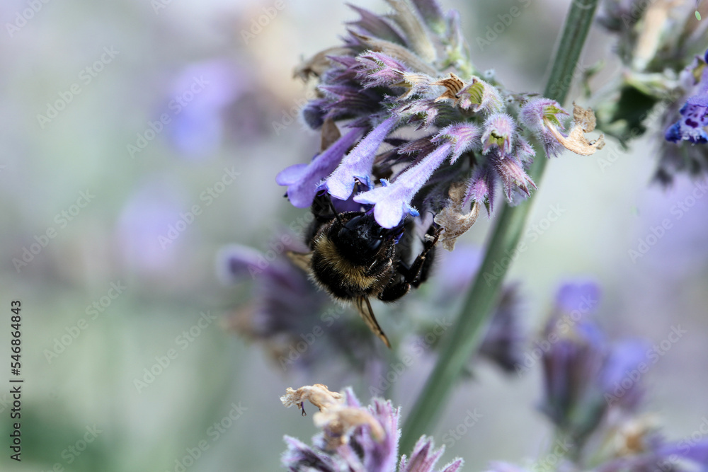 Insekten im Garten - Nahaufnahme einer kleinen Wiesenhummel beim Pollen sammeln auf den Blüten einer Katzenminze