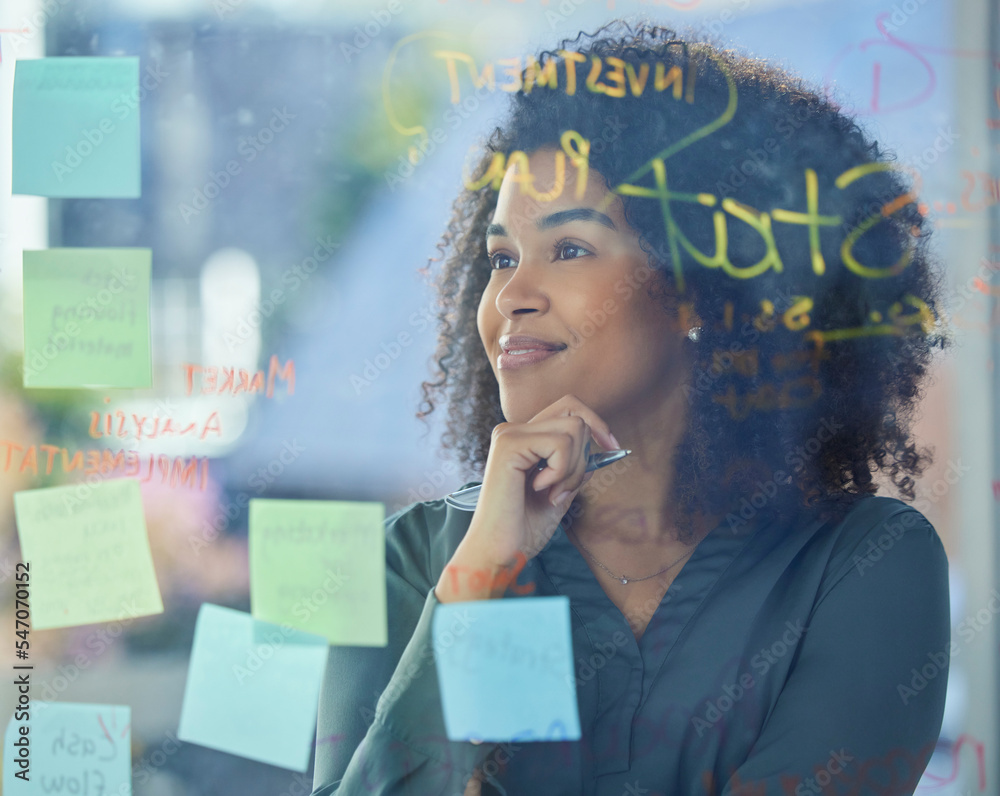 Black woman, business and brainstorming, board and postit notes with ideas for project, planning and strategy for marketing or investment firm. Thinking, professional and vision, innovation and plan