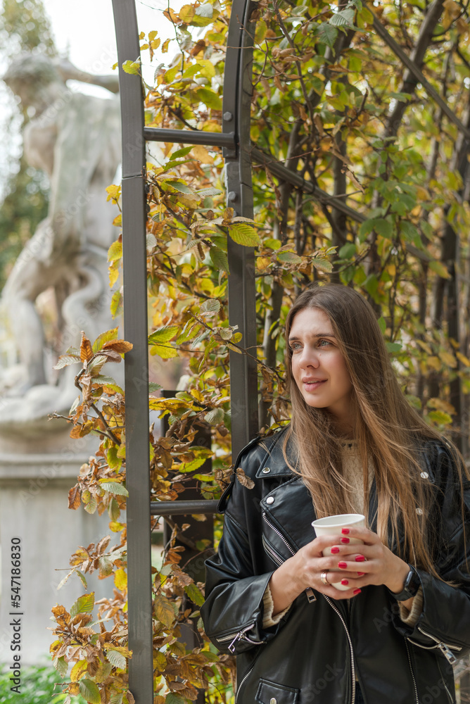 A beautiful woman is drinking hot tea and relaxing in a beautiful autumn park somewhere in Europe.