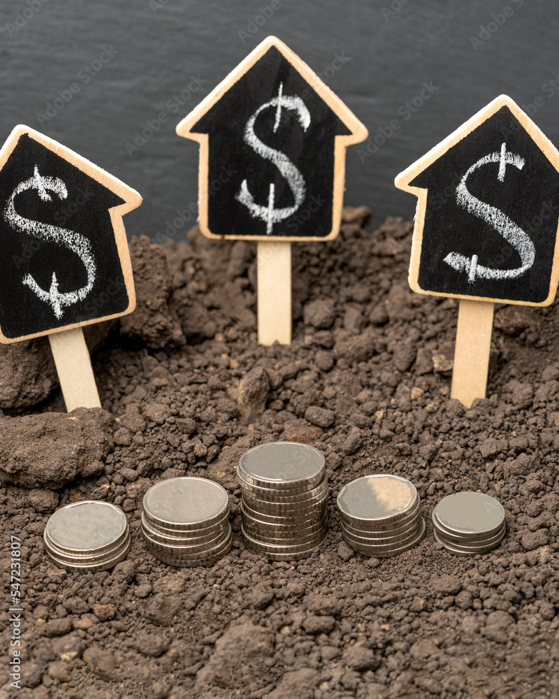 The figure of a house with a stack of coins Against the background of the earth. The concept of investment property and housing construction.