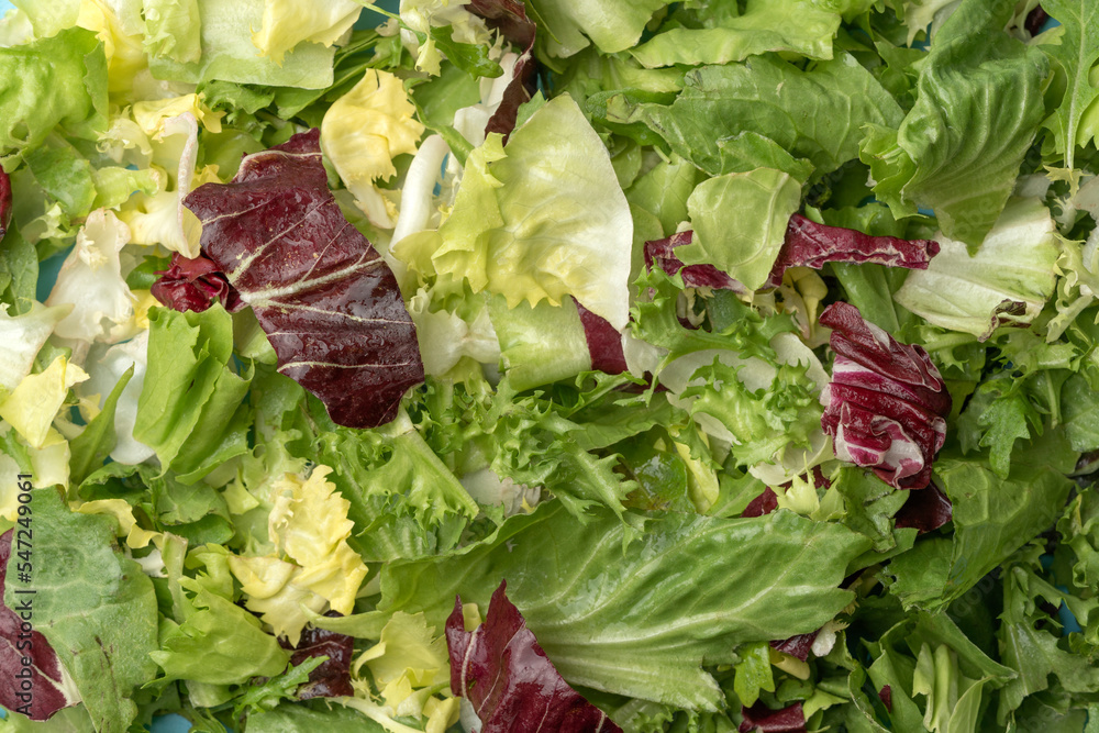 Salad mix leaves background. Fresh Salad Pattern with rucola, purple lettuce, spinach, frisee and chard leaf