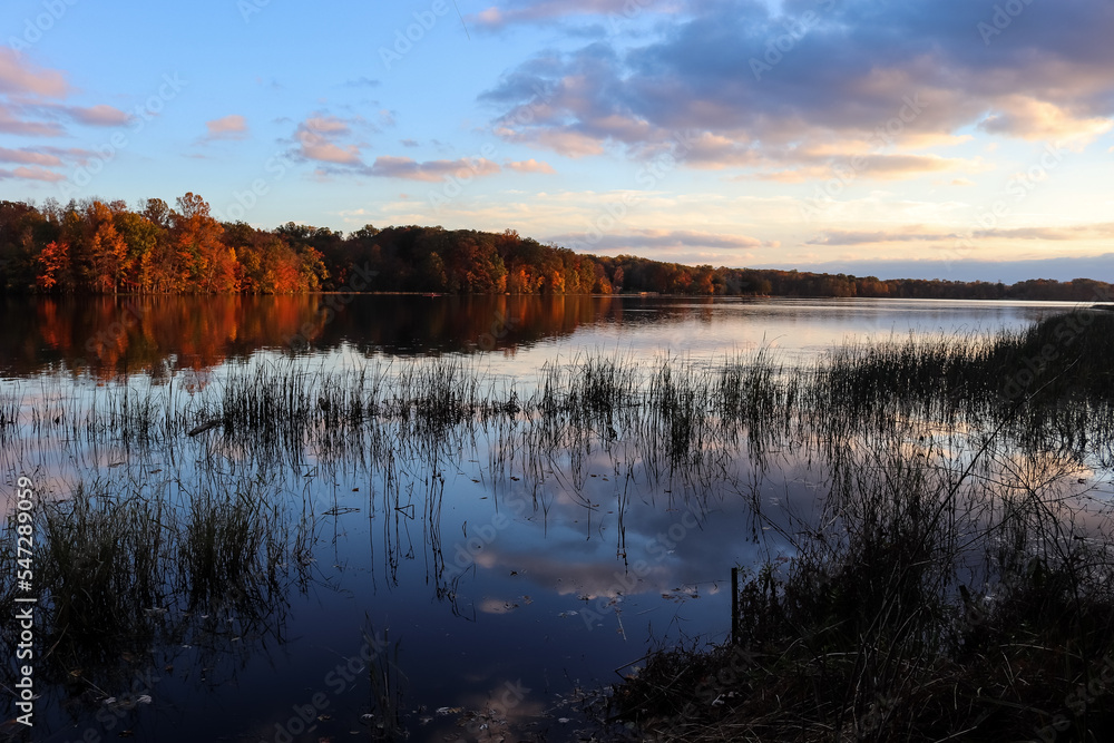 The suns sets over Gifford Pinchot Lake in Pennsylvania with all of the beautiful fall colors on display