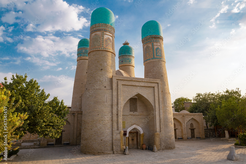 The ancient Chor Minor madrasah on a sunny September morning. Bukhara, Uzbekistan