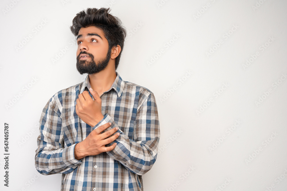 young hispanic bearded man wearing plaid shirt over white background with positive expression, has broad interested smile. Look there, please.looking for something or found something