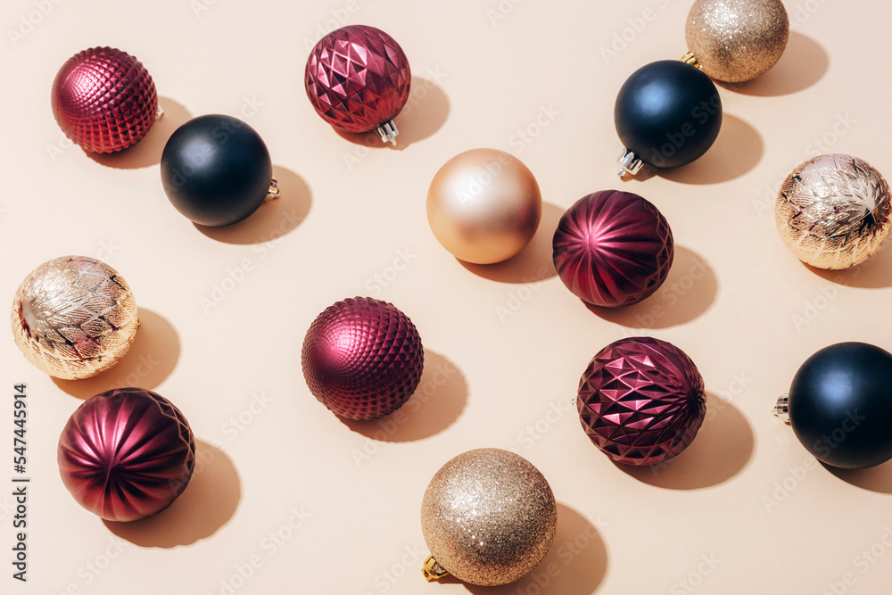 Colorful Christmas balls on light beige background with sharp shadows. Top view, flat lay, copy space