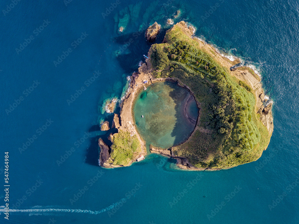 Azores aerial panoramic view. Top view of Islet of Vila Franca do Campo. Crater of an old underwater volcano. San Miguel island, Azores, Portugal. Heart carved by nature. Bird eye view.