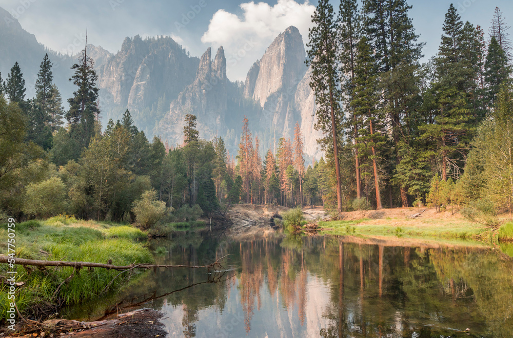 view of Cathedral Spires and Rocks from Merced riverbank, Yosemite National Park, California, US