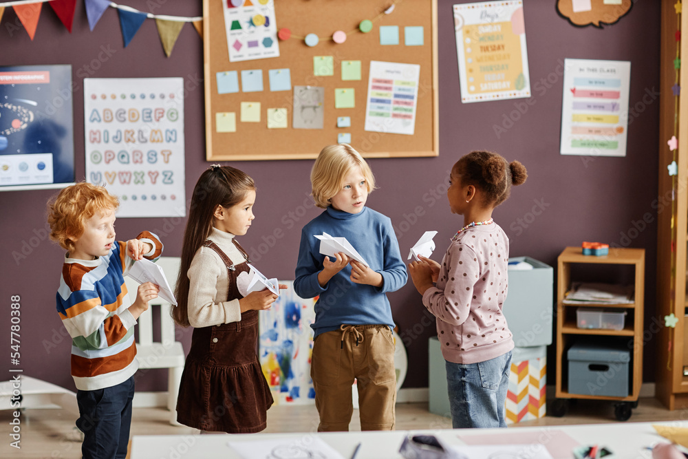 Group of four intercultural little learners of kindergarten in casualwear playing paper planes and interacting at break in classroom