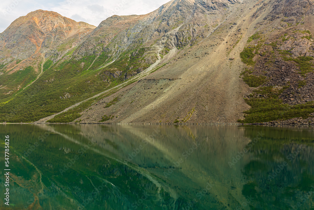 Rockfall reflecting in fjord in Lyngen, Norway.