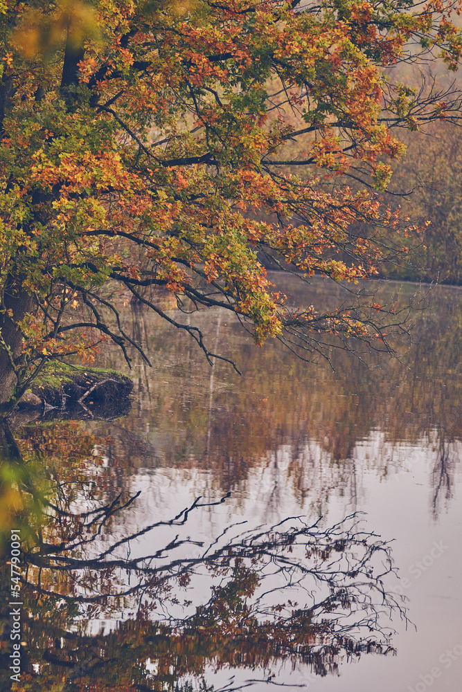 Fall colors reflecting in lake in the marsh in northern Germany. High quality photo