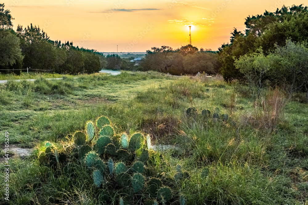 The sun is rising brightly behind a communication tower, looking like energy, and cactus pear in the grass in the foreground, Hill Country, Texas