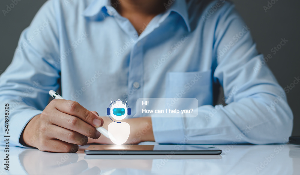 AI Chatbot intelligent digital business service application concept, computer mobile application uses artificial intelligence chatbots automatically respond online messages to help customers instantly