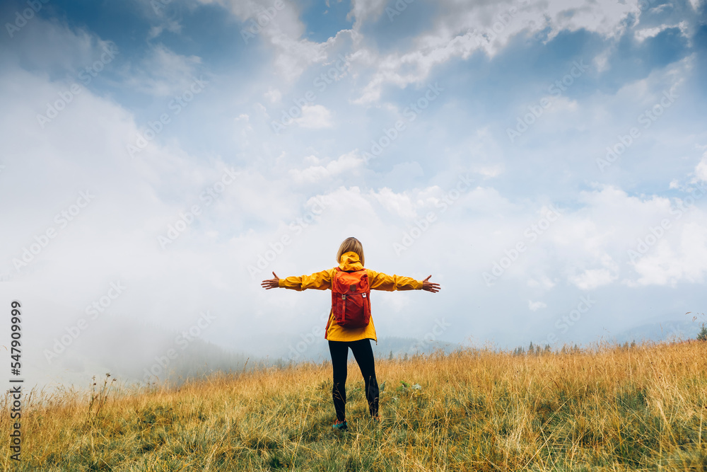 Cheering woman hiker open arms at fall mountains. Happiness Discovery Travel Destination Concept
